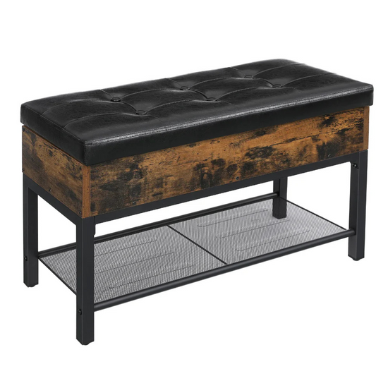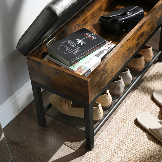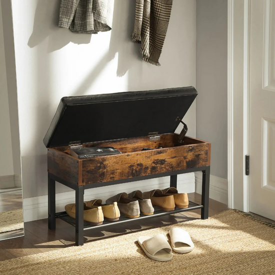 Su diseño industrial-chic, con la calidez del tablero rústico y la solidez del acero negro, se adapta a cualquier decoración. El asiento de polipiel acolchada no solo ofrece una comodidad superior para calzarte y descalzarte, sino que también esconde un práctico baúl ideal para guardar bolsos, bufandas o mantas. Además, la rejilla inferior es perfecta para organizar hasta 6 pares de zapatos, manteniéndolos siempre a mano y el área de entrada despejada.