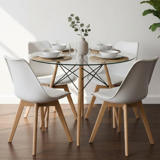 ¡Renueva tu espacio con el estilo y la funcionalidad del Set de Comedor Moderno Elida y Sillas Tulip! Este pack de diseño escandinavo es ideal para departamentos y comedores con espacio reducido, ofreciendo una solución elegante y práctica. La Mesa Redonda Elida de 80 cm de diámetro cuenta con una robusta cubierta de vidrio templado de 10 mm de espesor, garantizando durabilidad y fácil limpieza, mientras que sus patas de madera aportan calidez. Se complementa con cuatro Sillas Tulip en color blanco puro, que combinan un asiento ergonómico de polipropileno con cómodos cojines de poliuretano, asegurando el máximo confort y un toque de sofisticación nórdica.