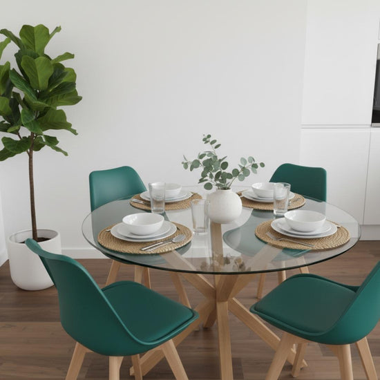 El conjunto se completa con 4 sillas Tulip en un vibrante y elegante Verde Esmeralda, que no solo ofrecen un diseño ergonómico excepcional, sino que se convierten en el punto focal de cualquier habitación. La base "Equiz" de la mesa, con su acabado tipo madera sobre acero, garantiza una estabilidad superior sin sacrificar la estética nórdica que buscas.
