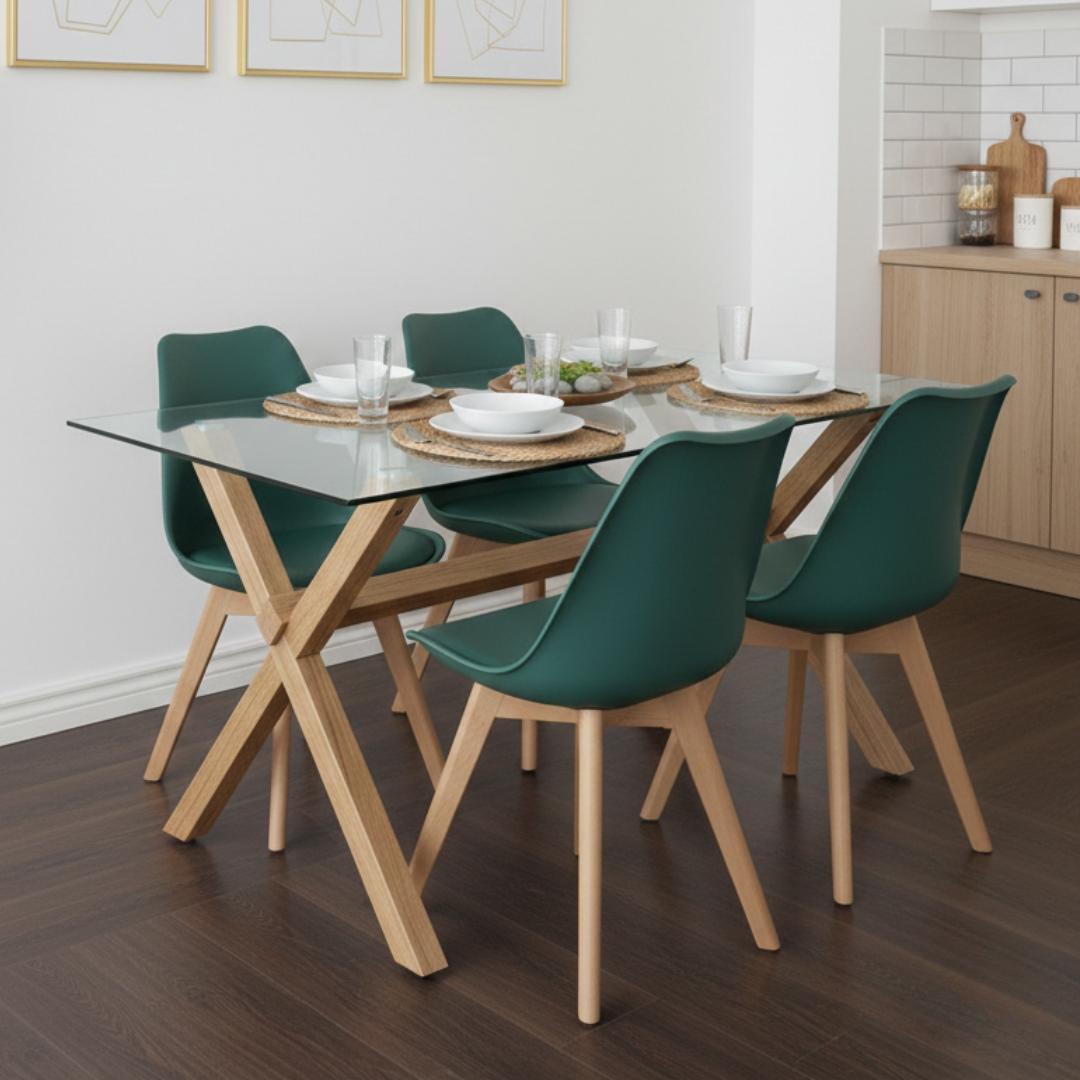 Comedor Moderno Mesa Xinia 130X80 + 4 Sillas Tulip Verde Esmeralda