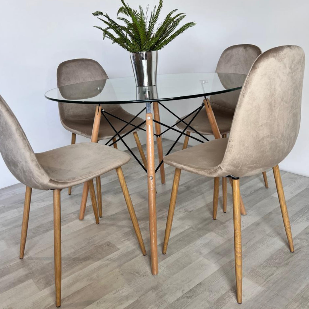 El juego de comedor Elida es la fusión perfecta entre diseño contemporáneo y funcionalidad. Su mesa redonda, con un diámetro de 100 cm, es ideal para crear un ambiente acogedor y fomentar la conversación. La cubierta de vidrio templado no solo aporta un toque de sofisticación, sino que también es resistente a las manchas y fácil de limpiar, convirtiéndola en una elección práctica para el día a día. Las patas de madera, con un acabado natural, añaden calidez y armonía al conjunto.