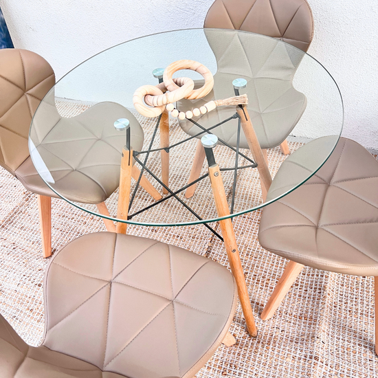 Fácil de limpiar: La cubierta de vidrio templado de la mesa y el tapizado de eco-cuero de las sillas permiten una limpieza rápida y sencilla.