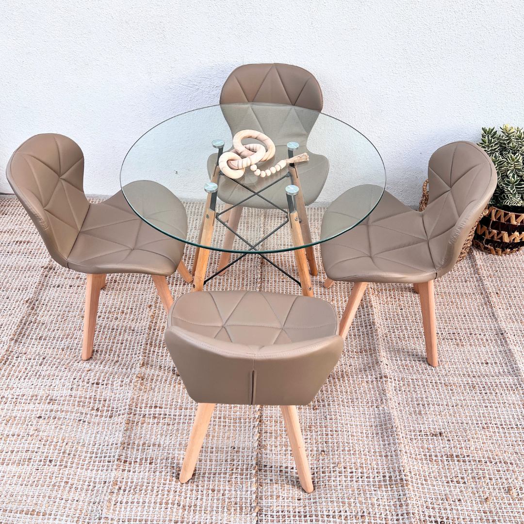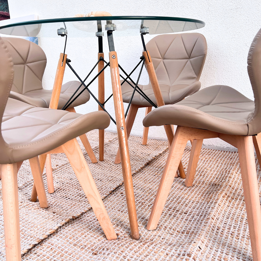 Las sillas Rubik Latte te ofrecen el máximo confort con sus asientos y respaldos acolchados, tapizados en un suave eco-cuero color latte. Sus patas de madera natural, que hacen juego con la mesa, aseguran durabilidad y resistencia. Con sus líneas limpias y diseño ergonómico, estas sillas son perfectas para disfrutar de largas sobremesas con familiares y amigos. Este comedor es la opción ideal para quienes buscan calidad, diseño y optimización del espacio.