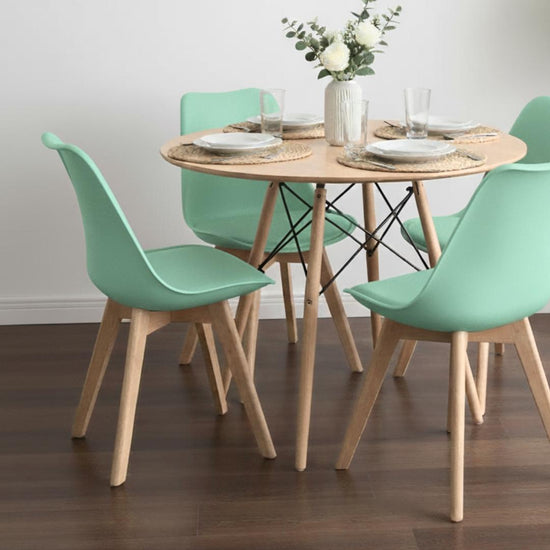 Este exquisito juego de comedor es la elección ideal para quienes buscan un equilibrio perfecto entre funcionalidad, estilo contemporáneo y máximo confort en espacios reducidos. Compuesto por la mesa redonda Shanna de $80 \text{ cm}$ de diámetro y cuatro sillas Tulip en un refrescante color Menta, su diseño de inspiración Nórdica/Escandinava se adapta con elegancia a cualquier decoración, desde moderna hasta minimalista.