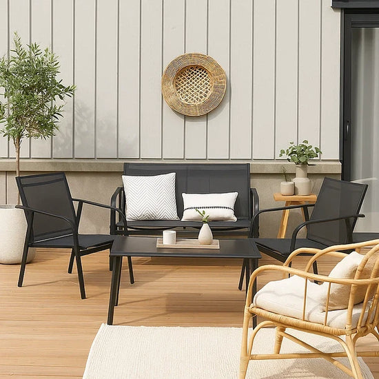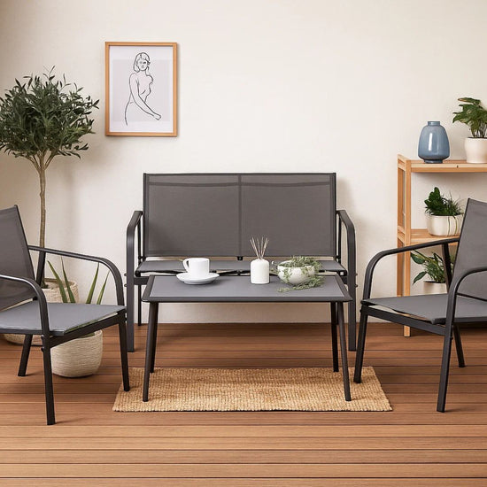 Disfruta del máximo confort y estilo en tu espacio exterior con nuestro elegante Juego de Terraza de 4 Piezas en tono Grafito.