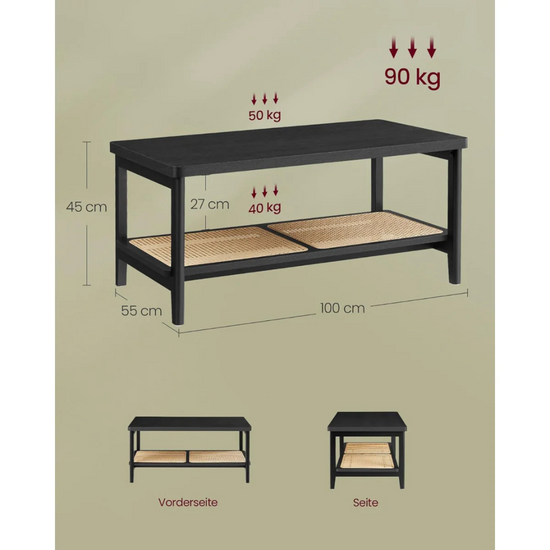 Su segundo nviel con tejido de ratán no solo añaden un toque de elegancia natural y textura, sino que también ocultan un amplio espacio de almacenamiento para que puedas guardar libros, revistas o cualquier objeto que desees mantener fuera de la vista. La superficie superior es ideal para colocar tus decoraciones favoritas, desde jarrones hasta portarretratos, o simplemente para tener a mano el control remoto y una taza de café.