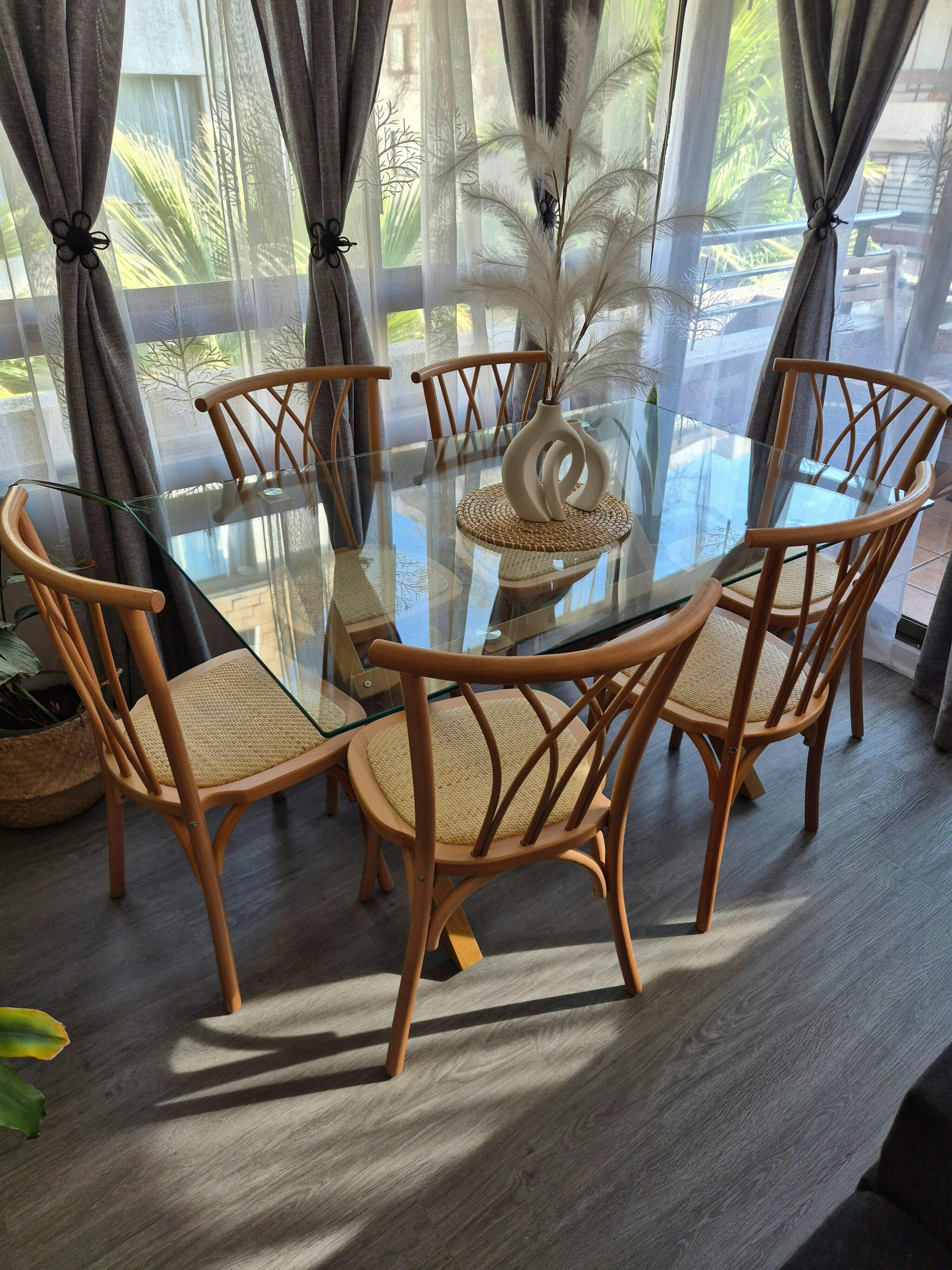 Mesa de Comedor Xinia: ¡Elegancia y funcionalidad en una sola pieza! Nuestra mesa Xinia es el complemento perfecto para cualquier espacio moderno. Con su diseño minimalista y líneas limpias, esta mesa de comedor rectangular combina a la perfección con cualquier estilo de decoración. Fabricada con vidrio templado de alta calidad y patas de metal con acabado similar a la madera natural, la Xinia es resistente y duradera. Su tamaño generoso de 140x90 cm la convierte en la opción ideal para compartir comidas y momentos especiales con familiares y amigos. ¡No esperes más para darle un toque de sofisticación a tu hogar!