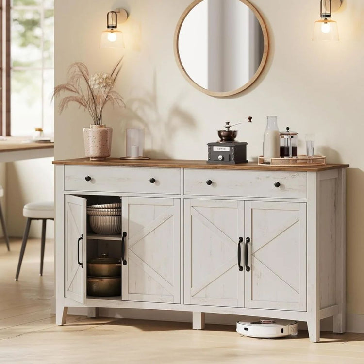 Diseñado para durar, su estructura robusta soporta hasta 120 kg en el tablero principal, convirtiéndolo en el soporte ideal para decoración, cafeteras o vajilla pesada. Sus cuatro puertas y cajones con divisores adaptables te permiten mantener el orden con total personalización.