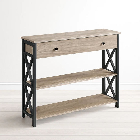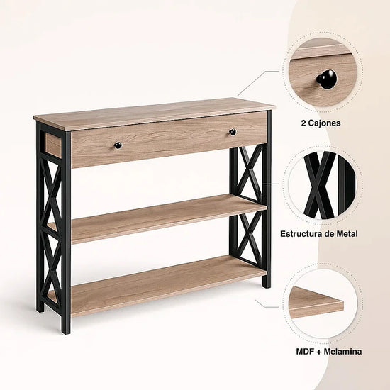 Su superficie de 100 cm es ideal para exhibir tus objetos de decoración favoritos, espejos o luminarias, mientras que sus dos cajones discretos ofrecen el almacenamiento perfecto para llaves, correspondencia y elementos esenciales que prefieres mantener fuera de la vista. La combinación de texturas cálidas en madera y la sobriedad del metal lo convierten en un elemento versátil capaz de adaptarse a estilos nórdicos, industriales o minimalistas.