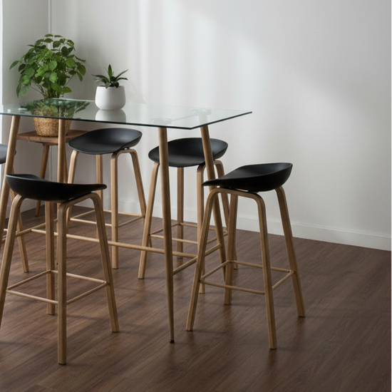 Transforma tu comedor o sala de estar con el Pack Mesa Alta Vitreo y 4 Taburetes Viggo, un conjunto que fusiona la elegancia moderna con la calidez del diseño nórdico. Este set es ideal para crear un rincón de bar en tu hogar, optimizando el espacio sin sacrificar el estilo.