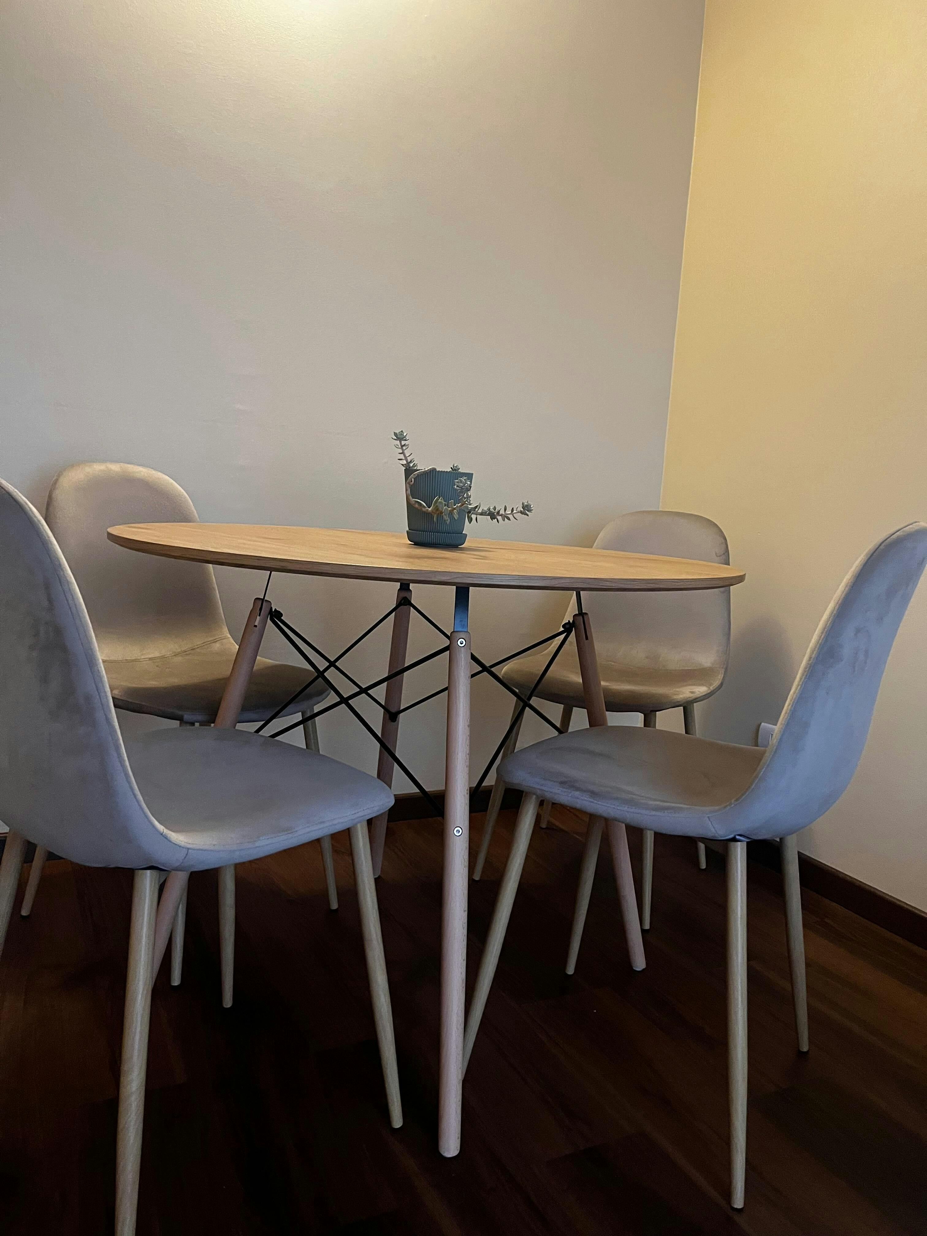 Su estructura de acero, con un acabado que imita a la perfección la calidez de la madera natural, garantiza una durabilidad excepcional y un soporte firme. Las patas, ligeramente inclinadas, aportan un toque de dinamismo y elegancia a la silueta de la silla, convirtiéndola en un objeto de deseo para los amantes del buen diseño.