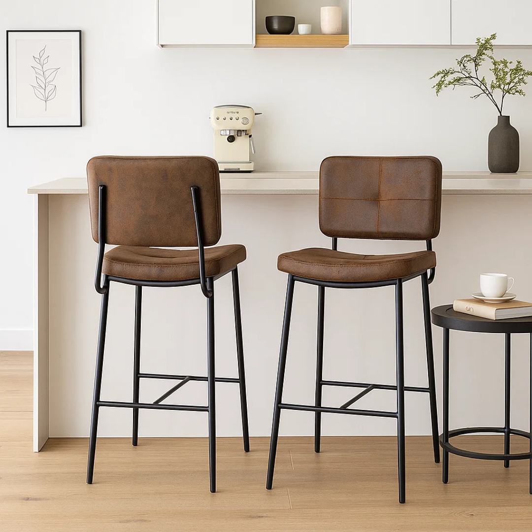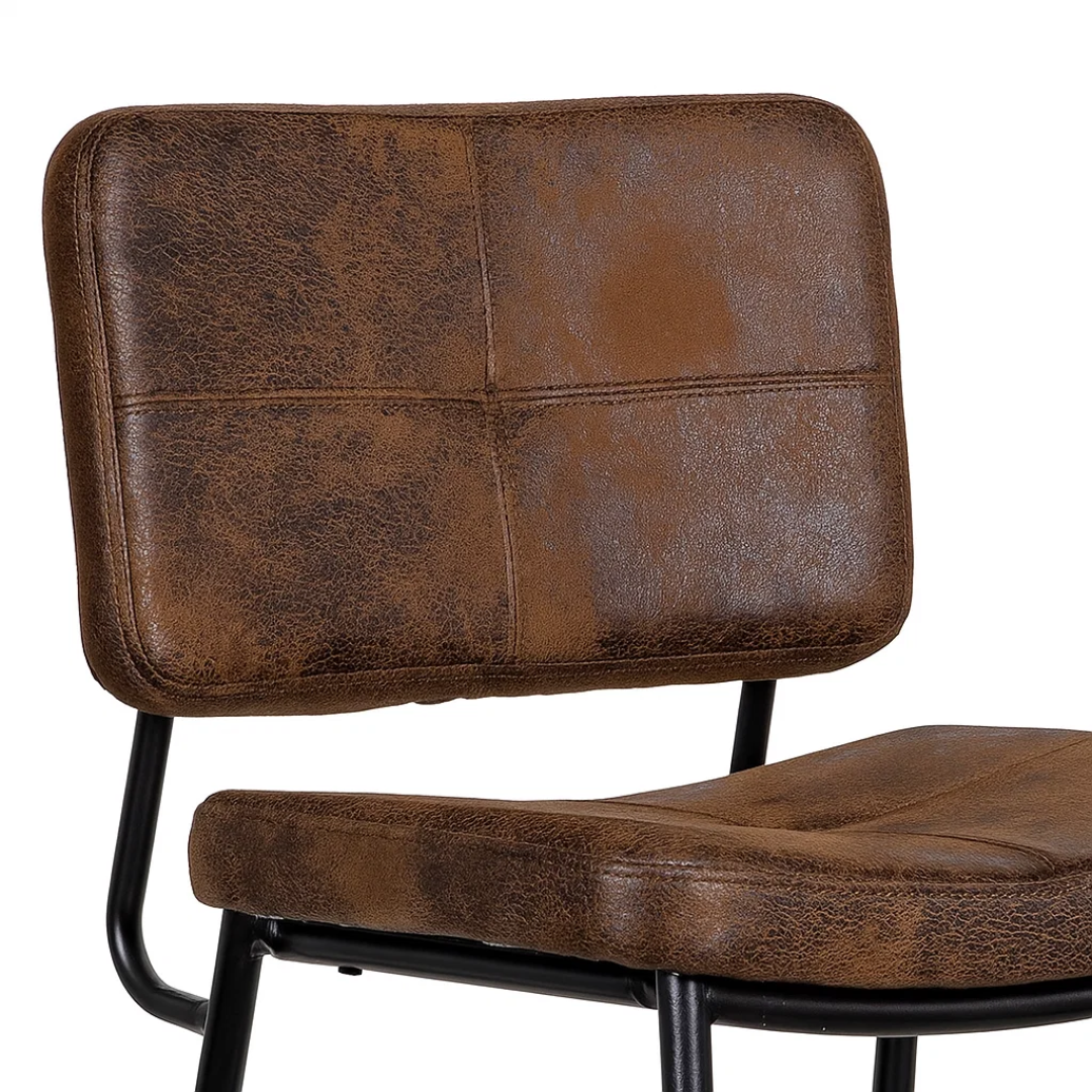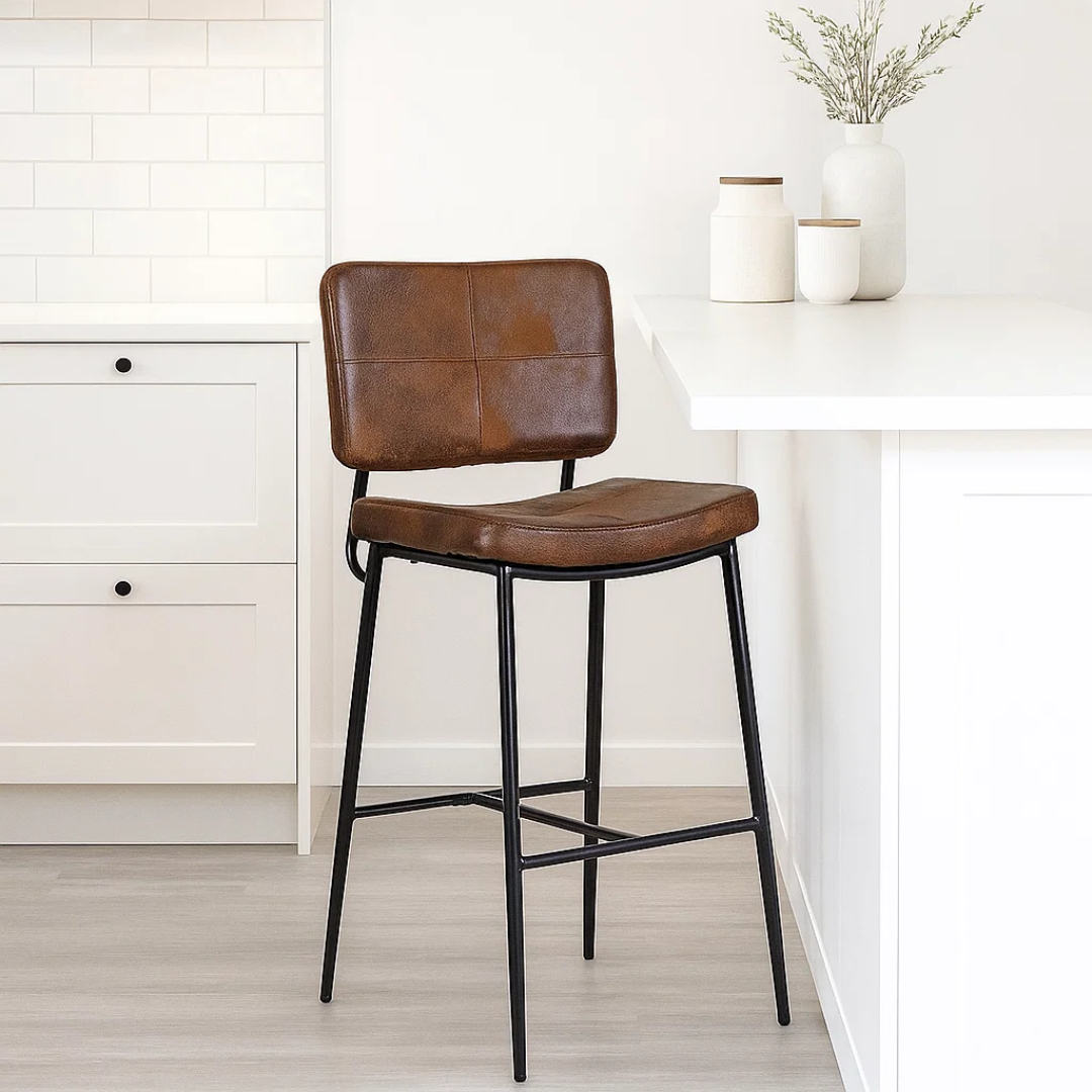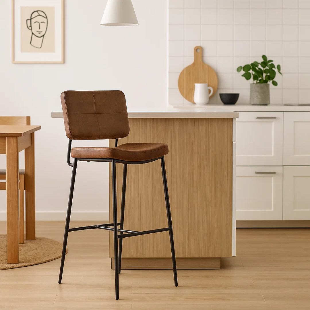 Este taburete cuenta con un asiento amplio y ergonómico, tapizado en cuero sintético de alta calidad en un elegante color café. Es un material no solo visualmente atractivo, sino también muy fácil de limpiar, ideal para el uso diario.